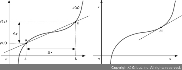 미분을 들어 본 적 있나요? 미분을 간단히 말하면 ‘한 지점에서의 기울기’를 의미합니다. 다음 그림과 같은 그래프가 있습니다. A라는 지점과 B라는 지점을 이으면 다음과 같은 기울기가 나오죠? 이때 A와 B 지점의 간격을 서서히 좁히면 어떻게 될까요? 그리고 A와 B가 만난다면요? 이때의 기울기가 바로 한 지점에서 기울기가 됩니다.