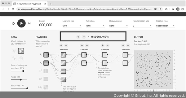 화면 위에서 HIDDEN LAYERS의 더하기, 빼기 버튼을 클릭하면 신경망층 개수를 수정할 수 있습니다.