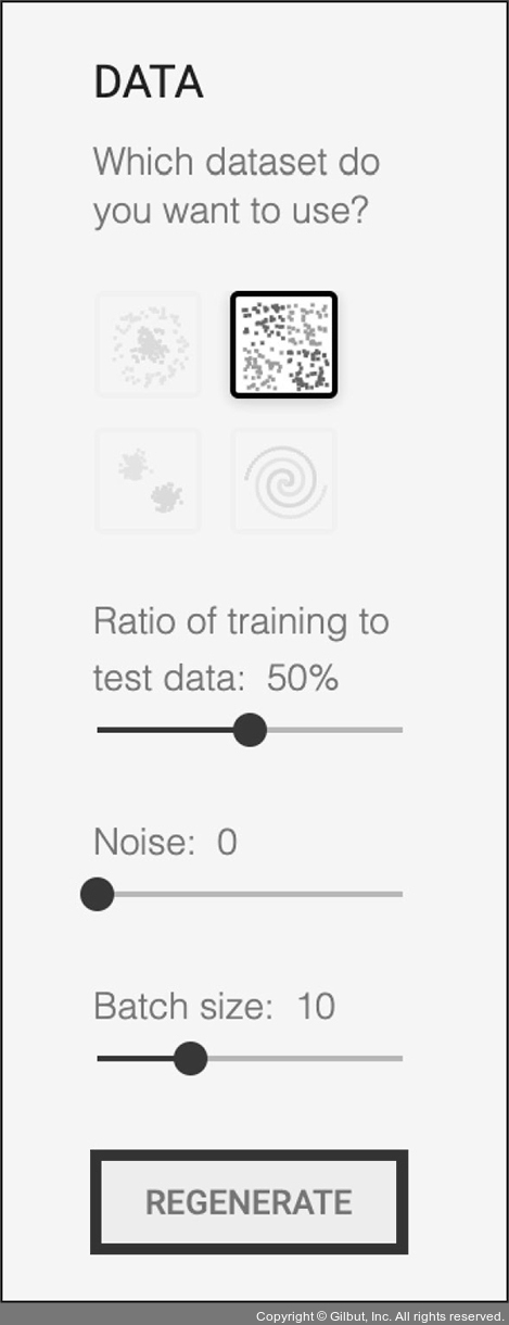 화면 왼쪽 DATA에서는 데이터의 입력 형태를 선택할 수 있습니다. 기본적으로 x축과 y축의 값을 입력합니다. 여기에 추가하여 각각의 값을 수정할 수 있습니다. 여러 값을 선택해서 입력해 보세요. 데이터의 형태, 검증 데이터와 훈련 데이터의 비율(Ratio of training to test data), 노이즈(Noise), 배치 사이즈(Batch size), 에포크(Epoch) 등 값을 수정한 후 REGENERATE(재생성) 버튼을 클릭해 보세요.