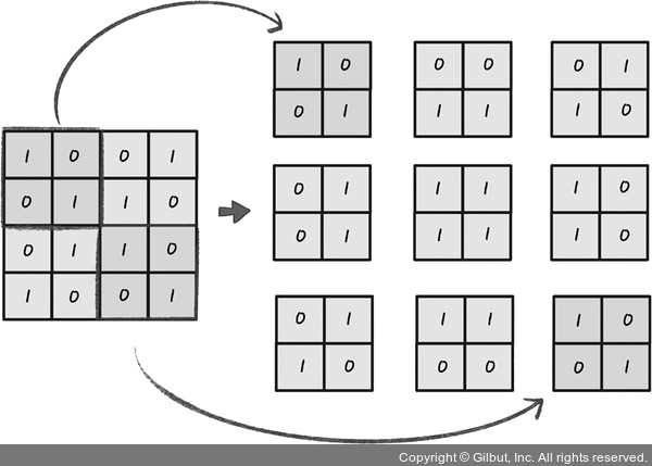 그림 8-1에서 살펴본 픽셀로 된 숫자 0을 2×2, 즉 4칸씩 뽑아냅니다. 이러한 과정을 거쳐 부분의 특징을 찾아낼 수 있죠.