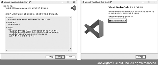 설정을 마치면 드디어 실제로 설치할 차례입니다. 설치 버튼을 누릅니다. 금방 설치되었네요. 바로 실행하여 확인할 테니 ‘Visual Studio Code 실행’에 체크한 채로 종료 버튼을 누르세요.