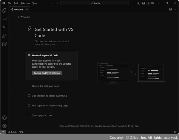 다음 그림과 같이 깔끔하고 간결한 메뉴로 구성된 비주얼 스튜디오 코드가 실행됩니다.