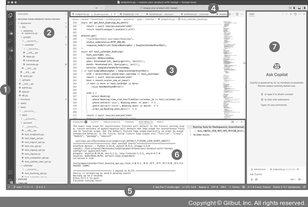 ➌ 편집 영역: 주 사이드 바 영역에 있는 요소를 선택하면 그 요소 작업을 상세하게 이 영역에서 할 수 있습니다. 대개는 편집 같은 작업을 합니다. 예를 들어 주 사이드 바가 파일 탐색(explorer) 상태고 이 영역에 나열된 파일 중 하나를 선택하면, 그 파일을 ➌ 영역에 보여 주거나 편집할 수 있도록 여는 것이지요. 이 ➌ 영역 이름은 에디터(편집 영역)인데, 비주얼 스튜디오 코드 자체를 지칭하는 에디터인지 C 영역을 지칭하는 에디터인지 구분되지 않으므로 필자는 ‘편집 영역’으로 부르겠습니다.