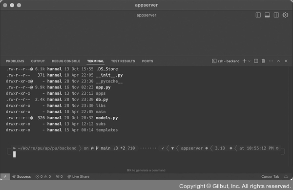 그러면 다음 그림과 같이 작업 기준 디렉터리를 시작 경로로 하여 터미널이 열리며 셸이 시작됩니다. 단축키는 Ctrl+ Shift + ` 인데, 키 조합이 복잡하여 필자는 Command + J(Ctrl+ J)를 누른 후 TERMINAL 탭을 누르는 편입니다.