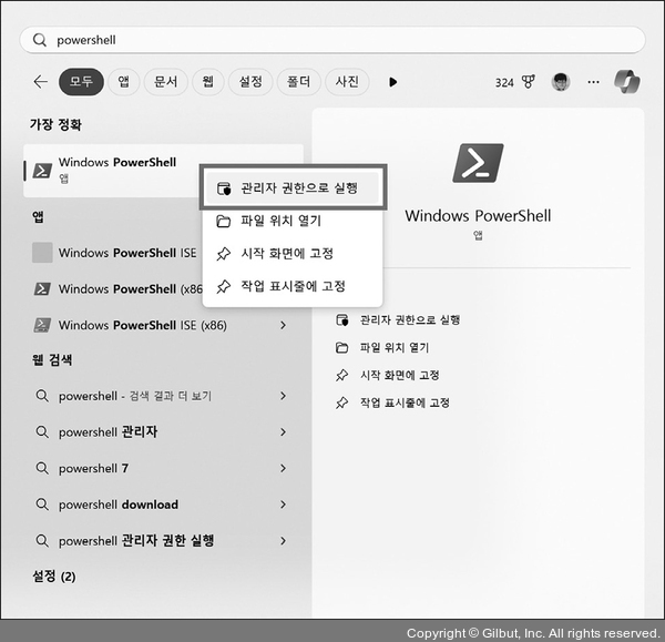 이 문제는 권한을 부여하면 해결됩니다. 먼저 파워셸 앱을 관리자 권한으로 실행합니다.