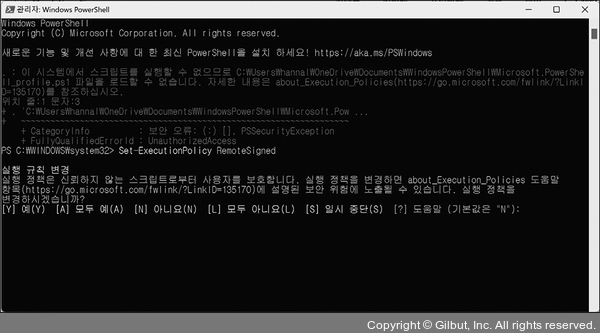 명령어를 실행하면 실행 정책을 변경할지 물어보는데, A를 눌러 모두 ‘예’라고 대답하면 됩니다. 설정이 반영되면 문제없이 동작합니다.
