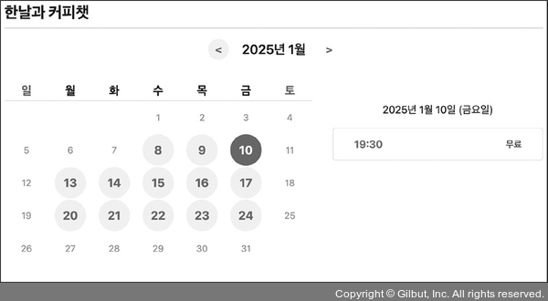 3. 가용 가능한 타임슬롯이 있는지 여부 표시: 호스트의 타임슬롯 모두가 부킹이 잡히면 해당 일자에서는 더 이상 약속을 잡지 못합니다. 이를 달력에 표시하는 기능입니다. 예를 들어 다음 그림과 같이 2025년 1월 6일과 7일은 가용한 타임슬롯이 없어 다른 일자처럼 옅은 파란색의 둥근 배경이 없습니다.