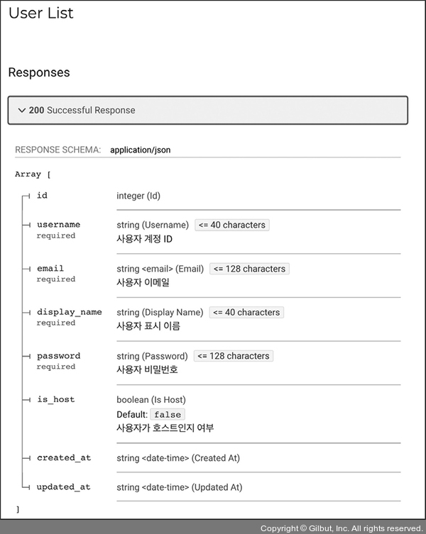 ⑤의 display_name 모델 필드에는 특이 사항이 없습니다. username부터 사용한 description 인자를 살펴보겠습니다. 이 인자는 Pydantic에서 사용하는 것인데, FastAPI는 이 정보를 OpenAPI Specification 3나 ReDoc에서 사용합니다.