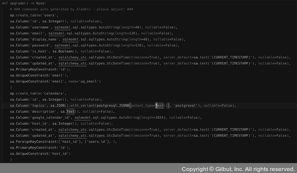잘 보면 sqlalchemy_utc 모듈을 사용하는데 이 모듈이 import되어 있지 않습니다. 그리고 sqlmodel.sql.sqltypes.AutoString도 마찬가지로 sqlmodel.sql.sqltypes 모듈이 import되어 있지 않은 문제입니다. Text()도 같은 이유고요. 이 셋은 앞으로도 마이그레이션 단계에서 종종 발생하는 문제이니 마이그레이션 스크립트를 생성할 때 항상 import해 놓는 것이 낫습니다.