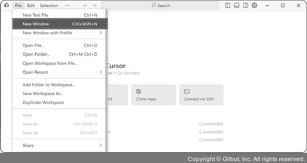 1. 바탕화면의 커서를 실행한 뒤 File > New Window를 클릭합니다.