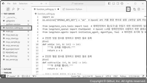 13. 탐색 창에서 function_calling.py를 클릭한 후 상단의 Run Python File을 클릭합니다.