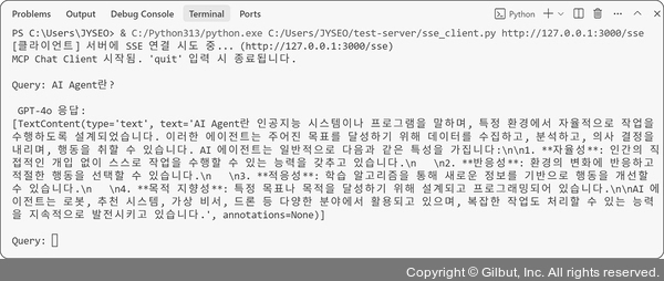 Query 부분에 또 다른 질문을 해보세요. 종료하려면 quit를 입력하면 됩니다.