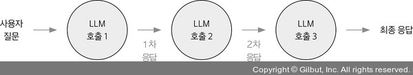 프롬프트 체이닝(prompt chaining)은 질문에 대한 최종 응답을 얻기 위해 단계를 나눠 LLM을 호출하는 방식입니다. 사슬(chain)처럼 각 단계의 출력이 다음 단계의 입력으로 사용되며, 이를 통해 복잡한 문제를 해결합니다.