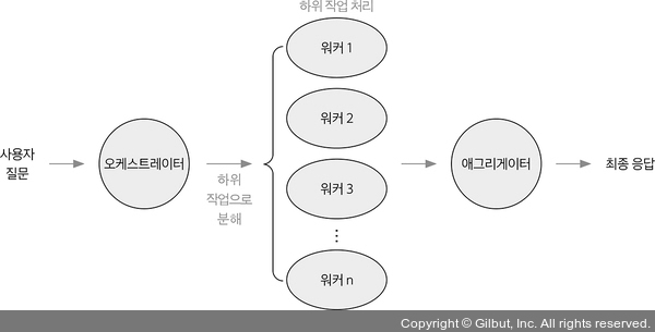 오케스트레이터-워커(orchestrator-worker)는 복잡한 작업을 처리하기 위해 여러 개의 하위 작업으로 나눈 후 각각의 작업을 개별 LLM 호출로 처리해 그 결과를 종합하는 방식입니다. 관리자 역할을 하는 오케스트레이터가 작업을 분석해 하위 작업으로 분해하고, 워커가 각각의 작업을 부여받아 자신만의 관점으로 정밀한 응답을 생성합니다.