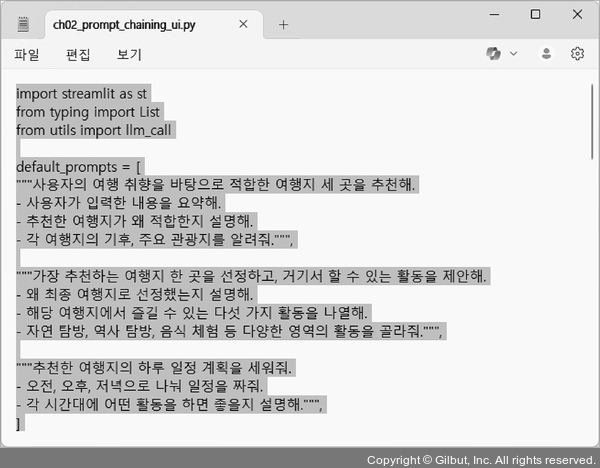 이 책의 소스 코드 > ai_agent > ch02_prompt_chaining_ui.py 파일을 선택하고 마우스 오른쪽 버튼을 눌러 [메모장에서 편집]을 클릭합니다. 메모장이 열리면 Ctrl + A, Ctrl + C를 눌러 전체 코드를 복사합니다.