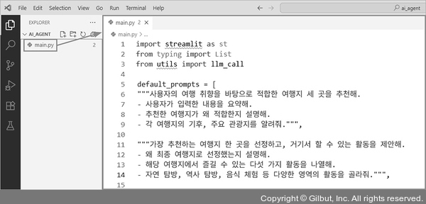 바탕화면에 ai_agent라는 폴더를 만들고, 앞으로 작성할 AI 에이전트 코드는 이 폴더에 저장합니다. VSCode에서 ai_agent 폴더를 열고 main.py라는 파일을 생성한 후, 앞에서 복사한 코드를 붙여넣고(Ctrl + V) 저장합니다(Ctrl + S).