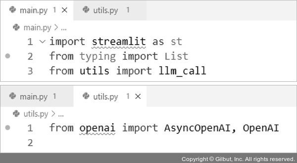 파이썬에는 특정 작업을 더 쉽게 처리하기 위해 미리 만들어둔 코드가 있습니다. 이러한 코드는 잘 정리된 패키지(package) 형태로 제공되며, 누구나 가져다 쓸 수 있습니다. 소스 코드 맨 위의 import로 시작되는 부분이 바로 패키지를 불러오는 코드입니다. 그런데 main.py 파일은 streamlit 패키지가, utils.py 파일은 openai 패키지가 설치되지 않은 상태라 물결(오류)로 표시됐습니다.