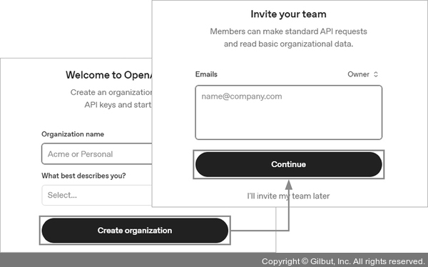 회원 가입 후 처음 로그인을 하면 API Key 발급 화면이 나오는데, 아무것도 입력하지 말고 [Create organization] 버튼을 클릭합니다. 팀을 초대할 계획이 없으니 다음 화면에서도 아무것도 입력하지 않은 채 [Continue] 버튼을 클릭합니다.
