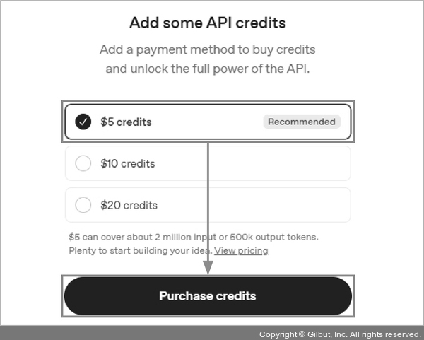 크레딧 구매(credit purchase) 금액으로 5달러를 선택하고 [Purchase credits] 버튼을 클릭합니다. 이렇게 하면 LLM을 사용할 수 있는 크레딧이 5달러만큼 주어집니다. 크레딧은 실제로 LLM을 사용한 만큼만 부과되는데, 이 책의 모든 예제를 실행하더라도 1달러 미만이면 충분합니다.