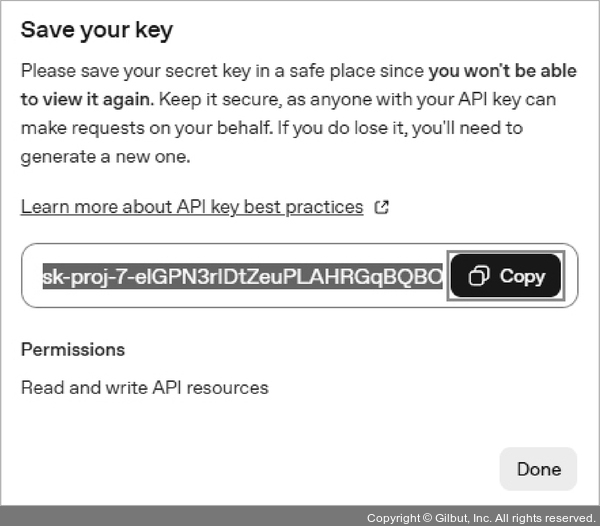 API Key가 생성되면 [Copy] 버튼을 클릭해 복사한 후 메모장을 띄워 붙여넣습니다. 이 API Key는 잊어버리지 않게 txt 파일로 저장해둡니다.
