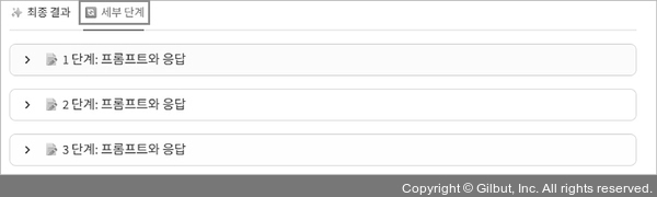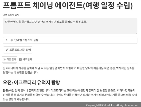 에이전트를 실행한 결과를 보면 [최종 결과] 탭에는 사용자의 여행 취향에 맞는 여행지와 세부 계획이 있습니다. 그리고 [세부 단계] 탭에서는 이러한 결과가 나오기까지의 3단계 및 그 세부 내용을 볼 수 있습니다(1단계: 여행지 세 곳 추천, 2단계: 가장 추천하는 한 곳 선정, 3단계: 선정된 여행지에서의 세부 일정 수립).