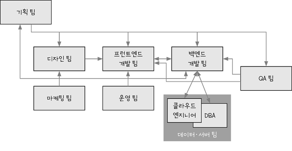 IT 서비스를 만들 때의 직무 간 협업은 다음 그림과 같이 이뤄집니다.