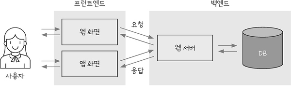 백엔드에서는 데이터베이스의 주문 내역을 저장하거나 상품 목록을 가져오는 일을 합니다. 그런데 사용자가 직접 데이터베이스를 다루기 어려우니 프런트엔드에서 웹 화면과 앱 화면을 만듭니다. 두 화면을 따로 개발하지만 같은 백엔드 서버에서 정보를 가져오기 때문에 사용자가 웹에서든 앱에서든 똑같은 기능을 이용할 수 있습니다. 이렇게 서비스에서 사용자가 보는 화면 영역을 프런트엔드(front-end), 뒤에서 데이터를 처리하는 영역을 백엔드(back-end)라고 합니다.
